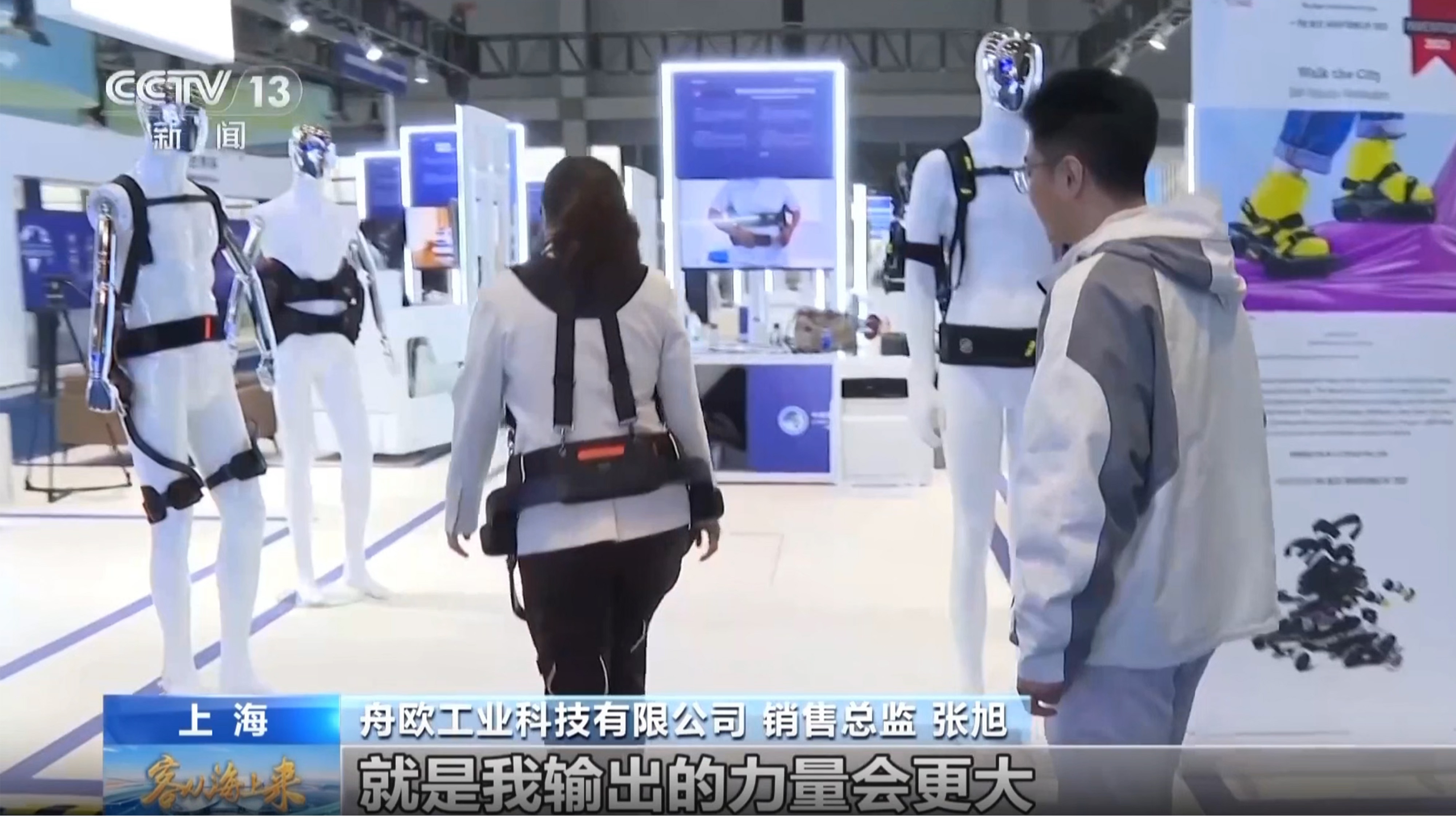 Zhang Xu, dyrektor sprzedaży Zhouou Industrial Technology Co., Ltd., przedstawił reporterom CCTV obecnym na wystawie: „Egzoszkielet wspomagający może być używany przez seniorów do wspinania się po górach, wchodzenia po schodach, a nawet do ćwiczeń rehabilitacyjnych”. Ten robot egzoszkieletowy, jako mechaniczne urządzenie do noszenia , działa w koordynacji ze stawami człowieka poprzez czujniki, dokładnie rejestrując ruch użytkownika zamiary ruchu nóg i automatycznie zapewniając pomoc podczas chodzenia , zasadniczo zwiększając możliwości użytkownika mobilność . W obszarze wrażeń związanych z wystawą Zhang Xu pomógł reporterowi założyć robota egzoszkieletowego w ciągu zaledwie jednej minuty . Kiedy reporter wstał i podjął kroki, urządzenie zareagował natychmiast zapewniając wsparcie zsynchronizowane z ruchami nóg. „Czuję, że moje nogi są wypchnięte do przodu” – powiedział reporter. Zhang Xu odpowiedział: „Tak, to bardzo ułatwia sprawę, szczególnie w przypadku kolan”.